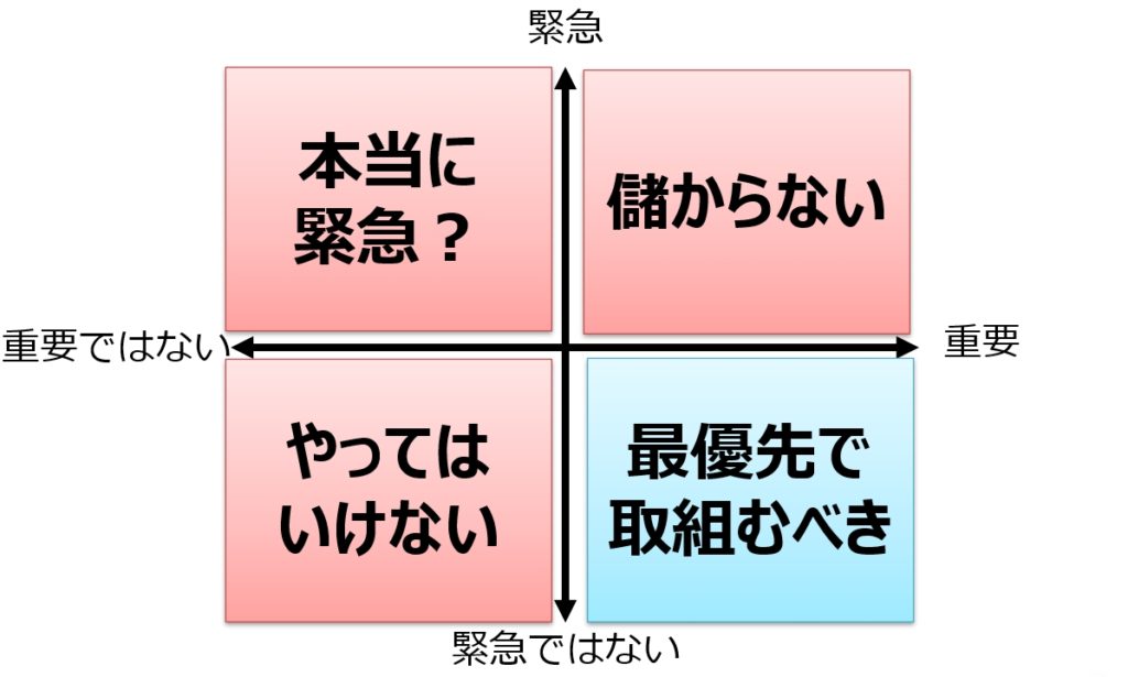 緊急且つ重要な仕事に追われていると、機会ロスが発生しまくるので、儲かりません、